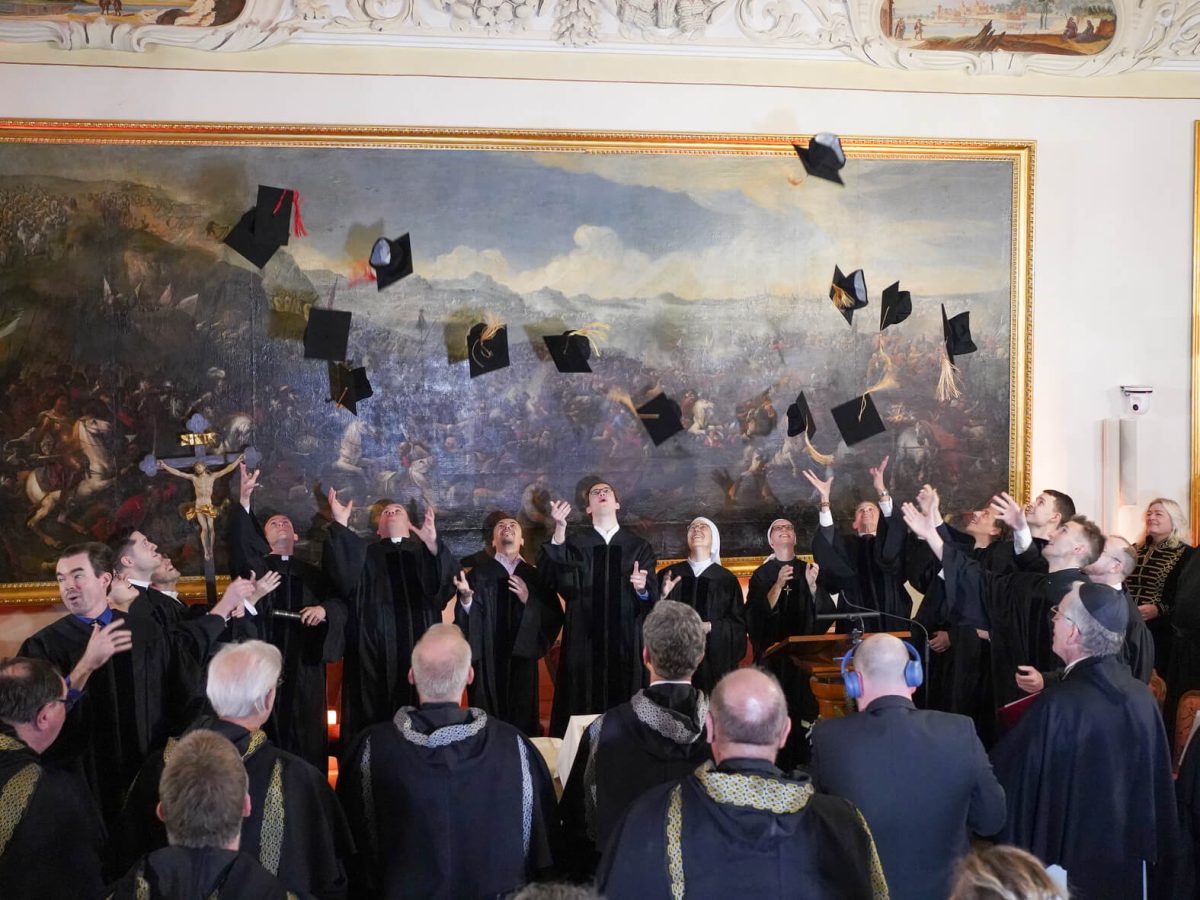 Am Vorabend des Hochfestes des heiligen Leopold, dem 14. November, nimmt traditionsgemäß der Großkanzler der Hochschule Heiligenkreuz, Abt Prälat Dr. Maximilian Heim OCist, um 16 Uhr die feierliche Sponsion der Absolventen im Kaisersaal vor. Die Feierlichkeit wird LIVE auf dem Kanal der Hochschule Heiligenkreuz übertragen. Schalten Sie ein und feiern Sie mit uns. Foto: Foto von der Sponsion im vorigen Jahr 2024.
