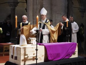 Unsere Kirche ist ein Haus Gottes. Während liturgischer Feiern (Beerdigungen, Hochzeiten, …) sind Sakristei und Kirche nicht zu besichtigen. Informationen erhalten Sie an der Pforte oder hier.