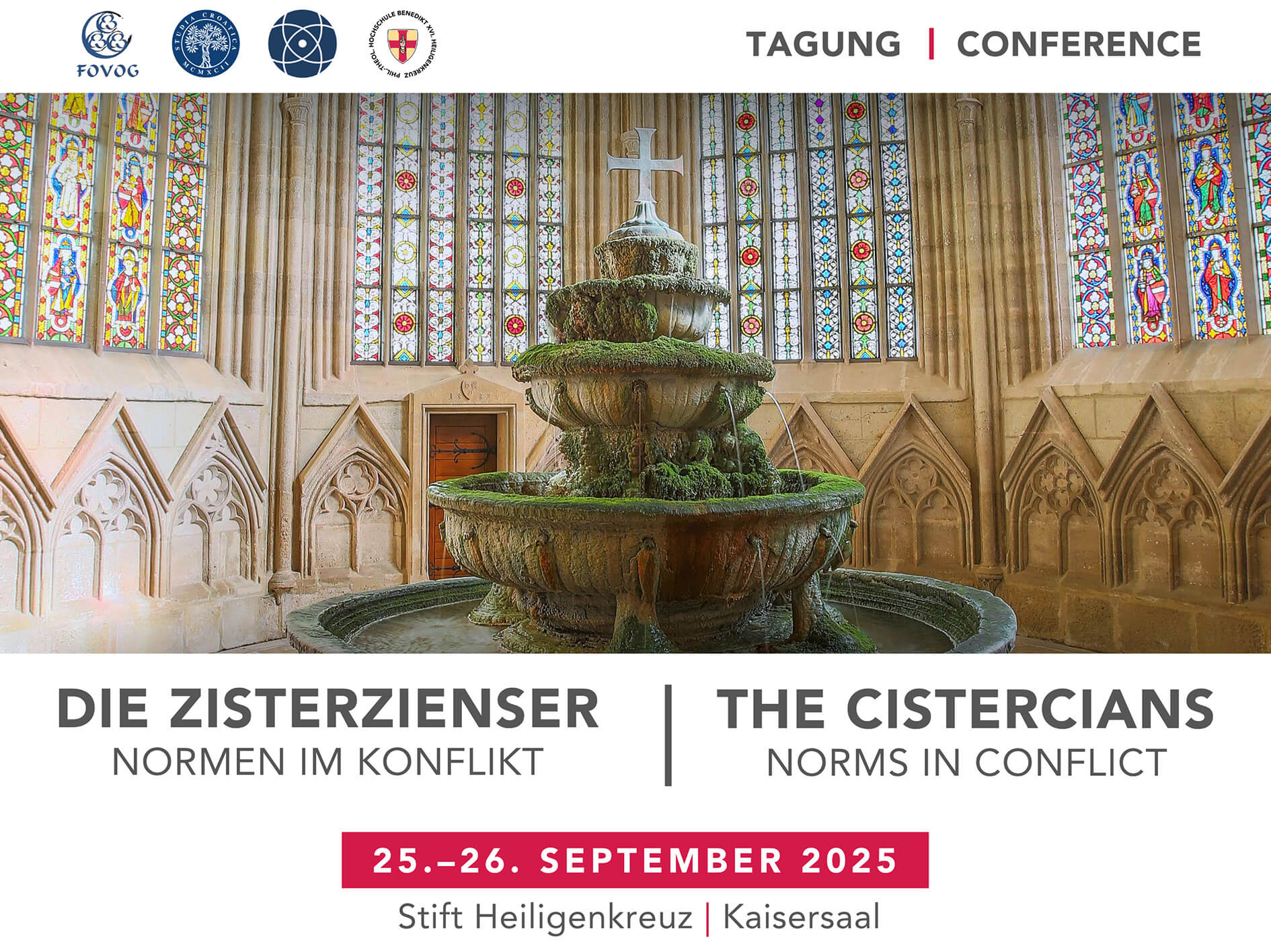 Von Donnerstag, 25. September bis Freitag, 26. September 2025 findet die Tagung „Die Zisterzienser – Normen im Konflikt“ im Kaisersaal des Stiftes Heiligenkreuz statt. Die Tagung findet in Kooperation zwischen der Technische Universität Dresden – Forschungsstelle für Vergleichende Ordensgeschichte (FOVOG), dem Research Centre of the Slovenian Academy of Sciences and Arts, France Stele Institute of Art History, Ljubljana, der University of Zagreb – Faculty of Croatian Studies und der Philosophisch-Theologischen Hochschule Benedikt XVI. Heiligenkreuz – Europainstitut für Cistercienserforschung EUCist statt. Die Vorträge sind deutsch- und englischsprachig. Beginn ist um 8 Uhr im Kaisersaal.
