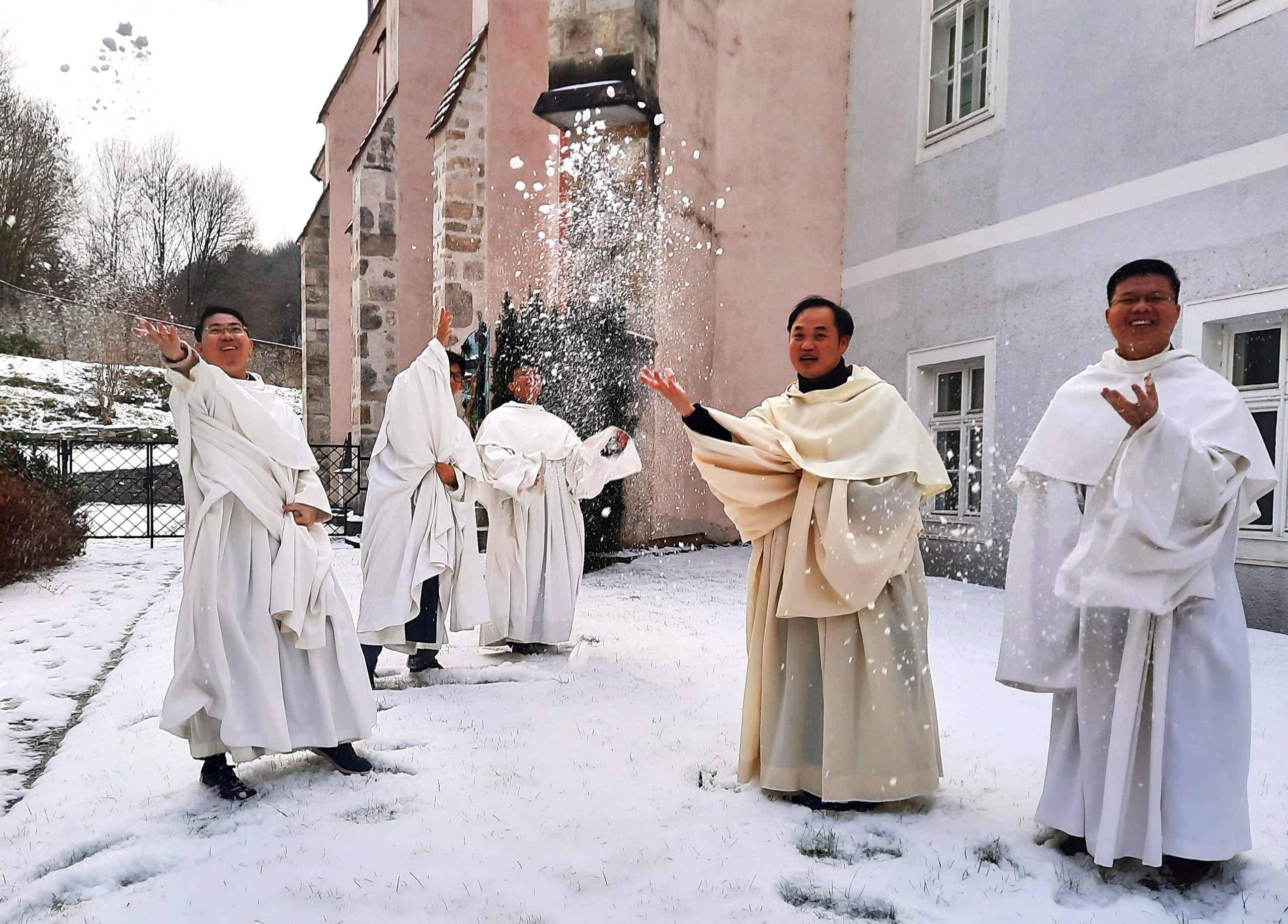 Für unsere beiden neuen Mitbrüder P. Vinzenz und P. Hilarius aus Vietnam, die zum Studium zu uns gekommen sind, gab es ein besonderes Erlebnis: Sie haben zum ersten Mal in ihrem Leben Schnee gesehen. In ihrem tropischen Heimatland kennen sie so etwas naturgemäß nicht. Auch wenn es noch nicht genug Schnee für einen Schneemann gab, war dieser Moment für die beiden dennoch etwas ganz Neues und Faszinierendes.