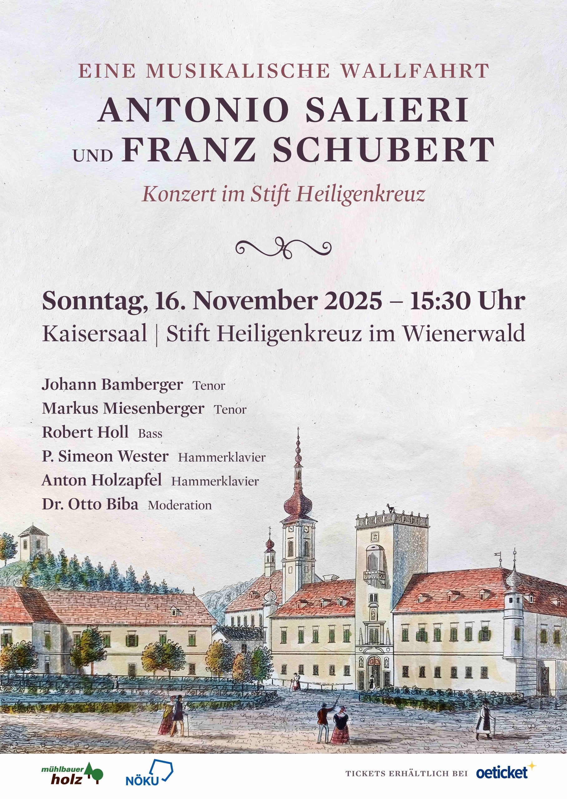 Herzliche Einladung zum Konzert: Antonio Salieri und Franz Schubert - Eine musikalische Wallfahrt! Am Sonntag, 16. November 2025 um 15:30 Uhr erklingen im Kaisersaal von Stift Heiligenkreuz musikalische Raritäten von Antonio Salieri und Franz Schubert mit zum Teil bisher unveröffentlichten Werken.