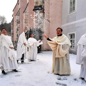 Für unsere beiden neuen Mitbrüder P. Vinzenz und P. Hilarius aus Vietnam, die zum Studium zu uns gekommen sind, gab es ein besonderes Erlebnis: Sie haben zum ersten Mal in ihrem Leben Schnee gesehen. In ihrem tropischen Heimatland kennen sie so etwas naturgemäß nicht. Auch wenn es noch nicht genug Schnee für einen Schneemann gab, war dieser Moment für die beiden dennoch etwas ganz Neues und Faszinierendes.