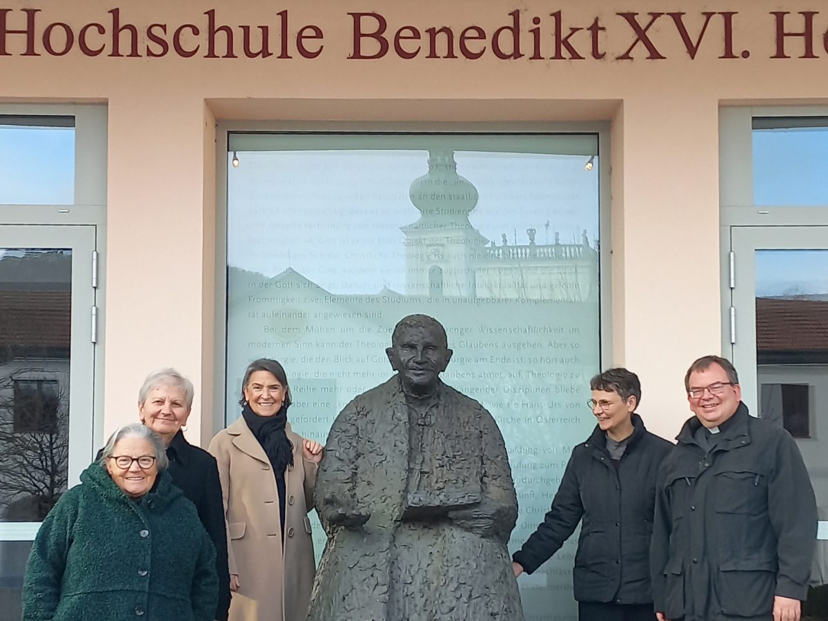 Am 8. November durften wir in Heiligenkreuz besonderen Besuch empfangen: drei Memores Domini, die für Papst Benedikt XVI. im Haus Mater Ecclesiae da waren und den Haushalt führten, wollten Heiligenkreuz besuchen. Schon viel hatten sie durch Papst Benedikt XVI. von Heiligenkreuz gehört. Nun wollten sie bei Ihrer Reise nach Wien, wo sie Sr. Christine, von der Gemeinschaft "Das Werk" besuchten, auch nach Heiligenkreuz kommen. Sr. Christine, eine Mitschwester von unserer Hochschulsekretärin Sr. Germana, gehörte selber viele Jahre zur sogenannten „Päpstlichen Familie“. Die Mitglieder der Vereinigung "Memores Domini" leben nach den evangelischen Räten in der Welt und führen ein Leben des Gebets, der Arbeit und des gelebten Glaubens. Ihr Name bedeutet „Damit sie des Herrn gedenken“ und beschreibt ihr zentrales Anliegen, Gott im Alltag bewusst im Herzen zu tragen und im Licht des Glaubens Sinn und Orientierung zu finden. Foto: Carmela Galiandro, Loredana Patrono, Rossella Teragnoli mit Sr. Christine Felder FSO vor der Hochschule Benedikt XVI. Heiligenkreuz.