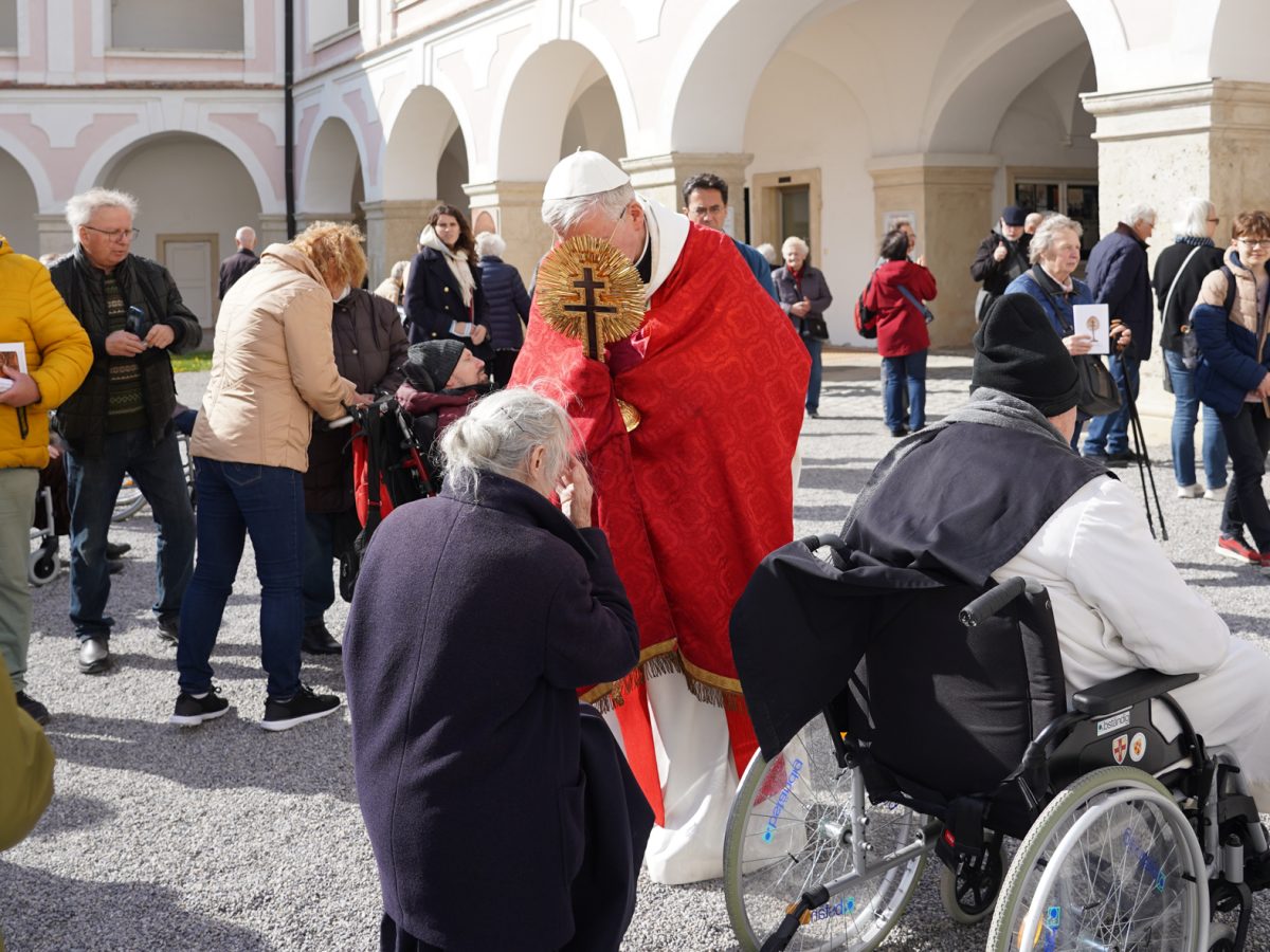 Seit die Kreuzreliquie 1982 in die eigens dafür errichtete Kreuzkirche übertragen und dort zur Verehrung ausgestellt wurde, zieht sie viele Menschen an, die hier in Stille beten. Häufig kommen auch Pilgergruppen, die bewusst kommen, um das Kreuz Christi zu verehren. Am vergangenen Sonntag, in der orthodoxen Tradition der Sonntag der Kreuzerhöhung, war eine große Pilgerschar der rumänisch-orthodoxen Gemeinden aus Wien, Niederösterreich und der Steiermark unter der Leitung von Bischofsvikar Dr. Nicolae Dura bei uns. P. Roman begleitete die Liturgie der Kreuzverehrung in der Stiftskirche.