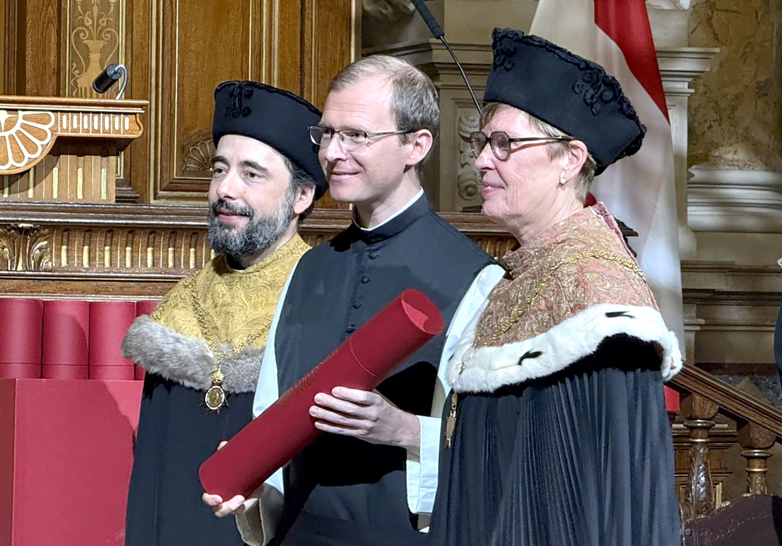 Nach dem Abschluss des Doktoratsstudiums „summa cum laude“ in Katholischer Fachtheologie (Bereich Religionspädagogik), fand am 17. November 2025 die Promotionsfeier von Pater Damian an der Universität Wien statt. Dekanin Prof. Dr. Andrea Lehner-Hartmann (rechts am Foto), die „Doktormutter“ von P. Damian, und Prof. Dr. Ioan Moga (links) als Promotor standen dem Festakt vor, an dem auch Abt Maximilian, Rektor Klausnitzer sowie Familienangehörige, Freunde und Wegbegleiter von P. Damian teilnahmen. Die mittlerweile publizierte Dissertation mit dem Titel „Feiernd lernen in Ritualen. Eine empirische Studie von Adventfeiern an öffentlichen Schulen“ beschäftigt sich mit schulischen Ritualen im Advent und geht der Frage nach, welche Kompetenzen Schüler dadurch erwerben können. Hier kann seine Doktorarbeit eingesehen werden.