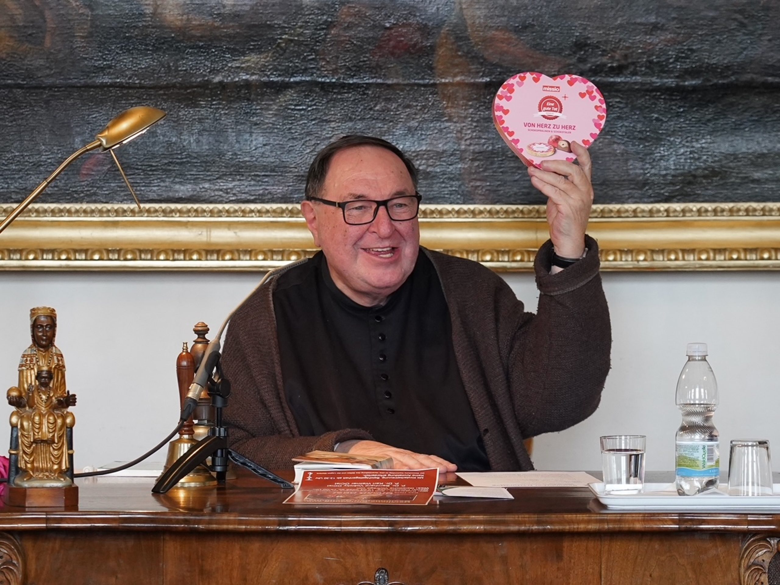 Foto: P. Bernhard macht Werbung für die Missio-Herzen – Von Herz zu Herz