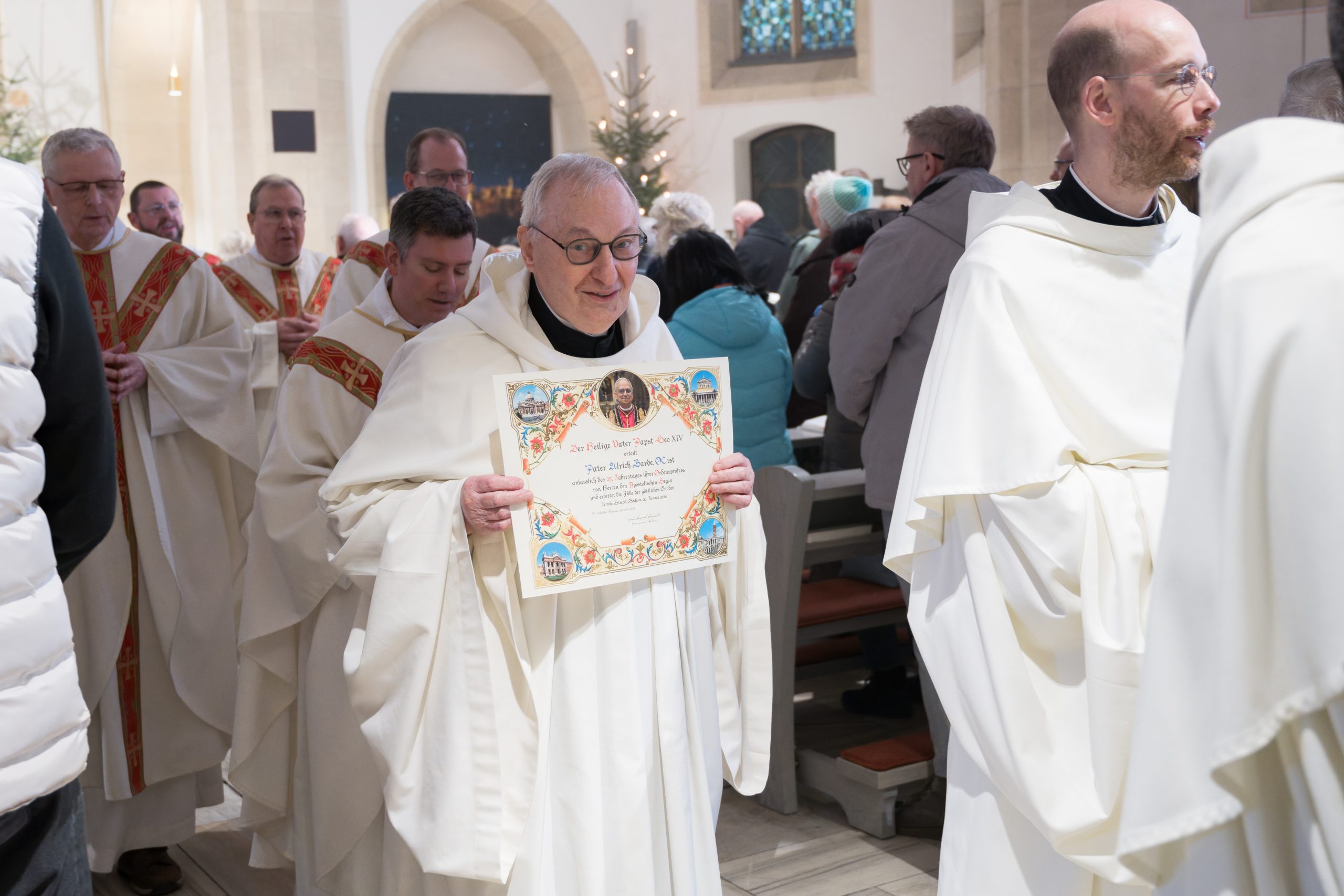 Am Samstag, dem 24. Januar, feierten unsere Stiepler Mitbrüder in einer voll besetzten Kirche St. Marien in Stiepel mit einem feierlichen Festgottesdienst den 25. Jahrestag der Mönchsprofess von P. Ulrich (Uwe Paul) Barde OCist, die er am 26. Januar 2001 abgelegt hatte. Unser Stiepler Prior P. Maurus war Hauptzelebrant, hielt die Festpredigt und nahm von P. Ulrich die Erneuerung seiner Gelübde entgegen. Musikalisch wurde die Feier vom Chor der Wallfahrtskirche St. Marien unter der Leitung unseres Organisten Matthias van den Hövel eindrucksvoll gestaltet. Zum Abschluss der Messe erhielt P. Ulrich eine Urkunde mit päpstlichem Segen. Anschließend kamen die Mitfeiernden zu einem festlichen Empfang im Pfarrheim zusammen.